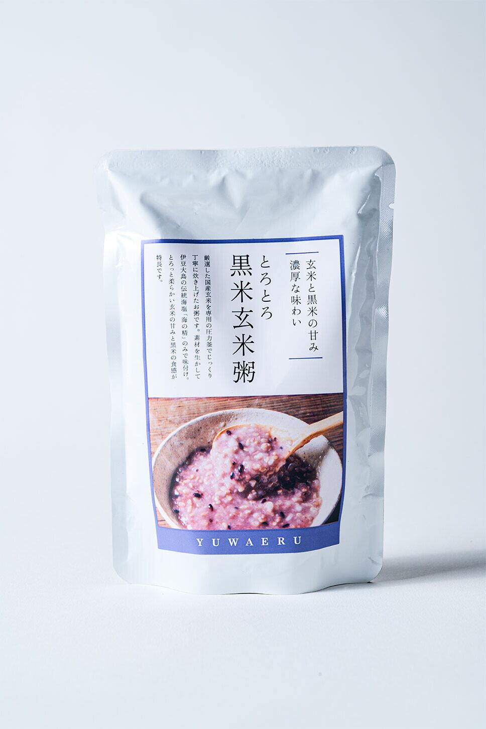 厳選した国産玄米を専用の圧力釜でじっくり炊き上げたお粥です。黒米は、ポリフェノールの一種「アントシアニン」を含み、鮮やかな紫色が特徴です。素材を生かして伊豆大島の自然海塩「海の精」のみで味付け。とろっと柔らかい玄米の甘みと黒米の食感が特徴です。
