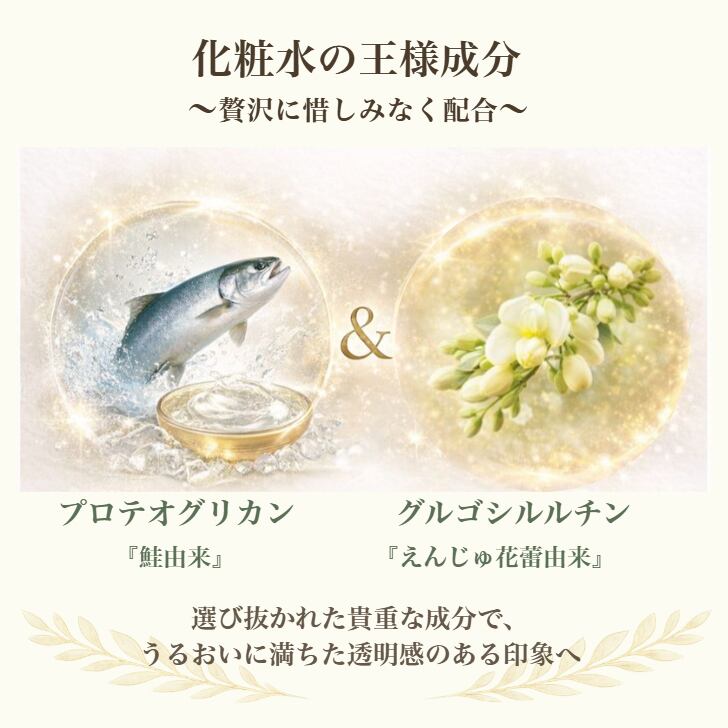 <全成分表示>天然由来水、カミツレ水(カミツレ花)、BG(さとうきび)、ゲットウ葉水(月桃)、アルピニアウライエンシス葉水(月桃)、水溶性プロテオグリカン(鮭)、グルコシルルチン(えんじゅの花蕾)、イザヨイバラエキス(イザヨイ薔薇)、スイカズラ花エキス(スイカズラ)、マンダリンオレンジ果皮エキス(マンダリンオレンジチンピ)、ウスニアバルバタエキス(ウスニアバルバタ)、グリセリン(アブラナ)、メボウキ花/葉エキス(メボウキ葉)、ハイビスカス花エキス(ハイビスカス)、サガラメエキス(海藻)、ハトムギ種子エキス(ヨクイニン)、オーキッドエキス(3種カトレア)、オリーブ葉エキス(オリーブの葉)、ダイウイキョウ果実エキス(ダイウイキョウ果実)、ペンチレングリコール(とうもろこし)