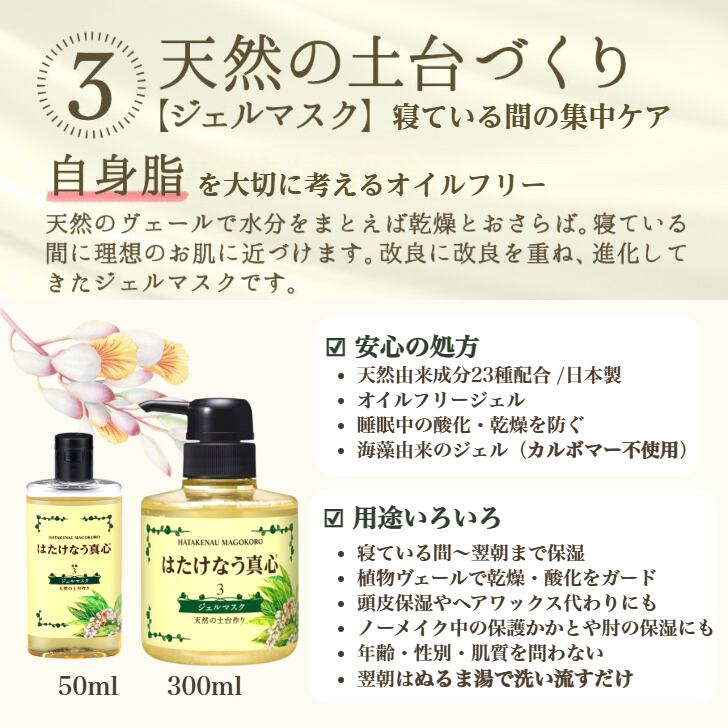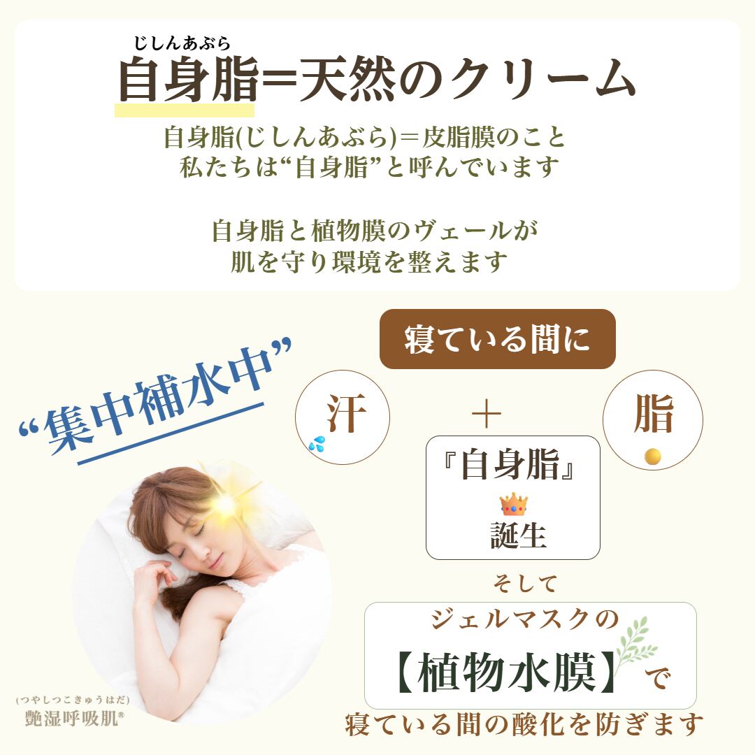 ジェルマスクで膜を張り、寝ている間にご自身の汗と脂が混ざる→免疫・殺菌力=常在菌の育成に。天然の土台作りを。